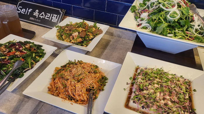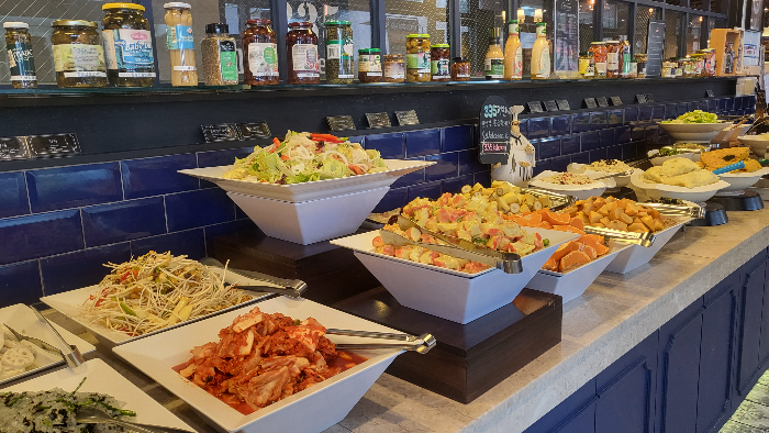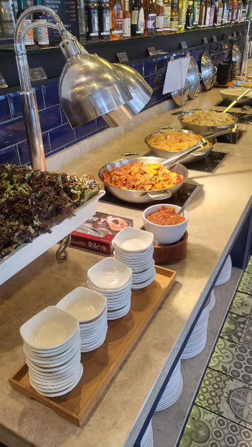 샐러드, 피자, 치킨, 튀김, 제육볶음, 쌈, 기본 반찬, 육수를 먹을 수 있는 뷔페입니다. 무한리필 뷔페라서 더욱 더 좋아요.