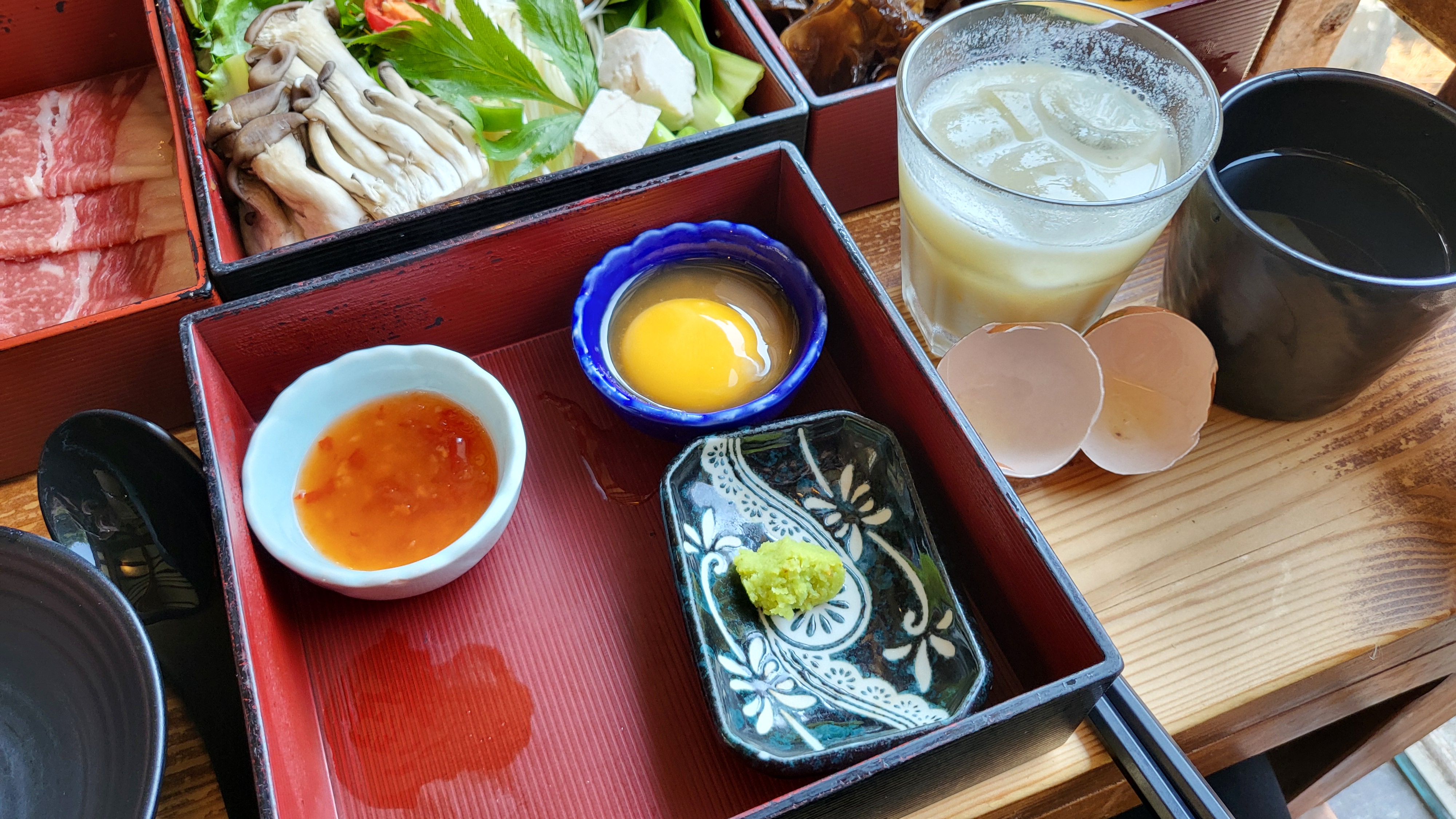 당귀도 한줄기씩 놓여져 있었는데 당귀로 인해 국물맛이 확 달라지기 때문에 취향에 맞게 넣어도 되고 안넣어도 된다고 알려주셨어요. 하나의 샤브에는 넣고 다른 샤브는 안넣어서 먹어봤어요.