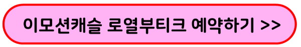 | - 이모션캐슬 로열부티크 이용 방법 - ① 네이버 예약하기 (로그인) ② 날짜, 시간 선택 (남은 수량이 뜹니다) ③ 추가 정보 기입 (이름, 성별, 연령대, 신장, 체중, 동반 입장 인원 체크) ④ 결제하기 ![]() ▲이모션캐슬로열부티크 더 알아보기 |